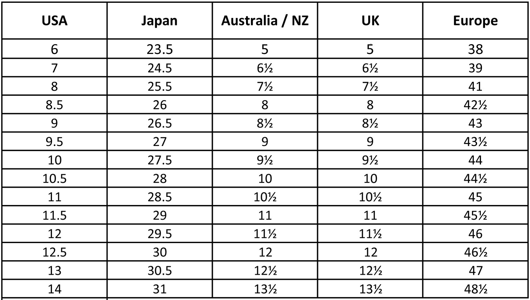 Men’s Shoe Size Chart Printable