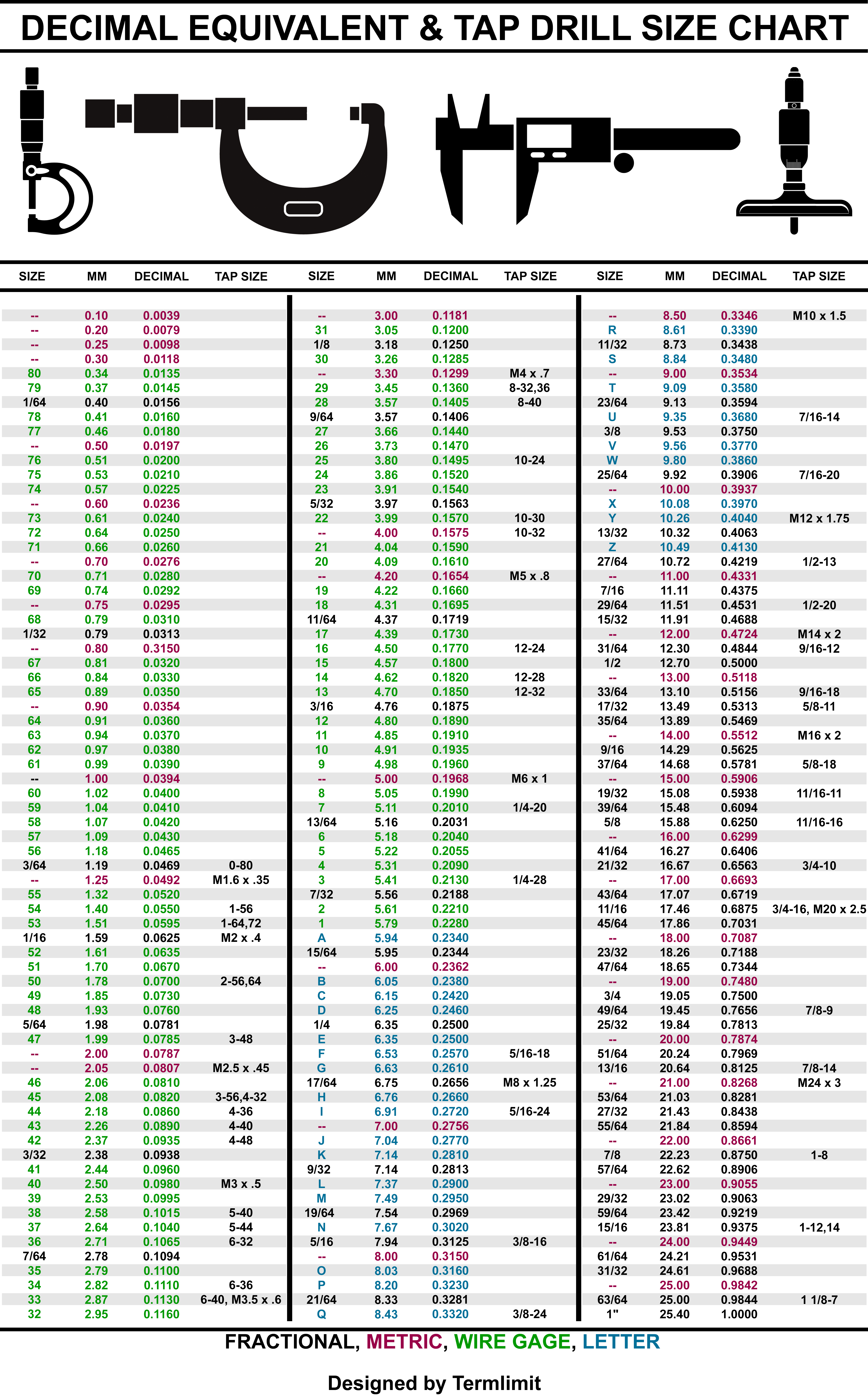 Wanted A Tap Drill Chart But Couldn t Find One That Exactly Fit My Requirements Designed My Own Figured I Would Share For Others To Print And Use Open To Suggestions As Well