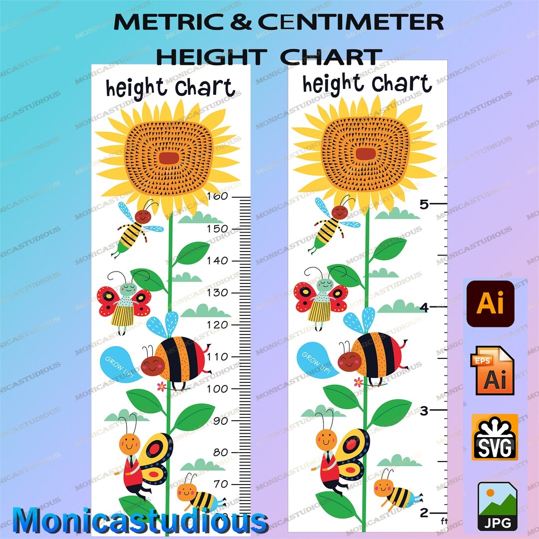 Kids Height Chart sunflower And Bee Growth Chart Digital Print cartoon Animals Height Chart Eps kids Growth Ruler metric centimeter Feet Etsy