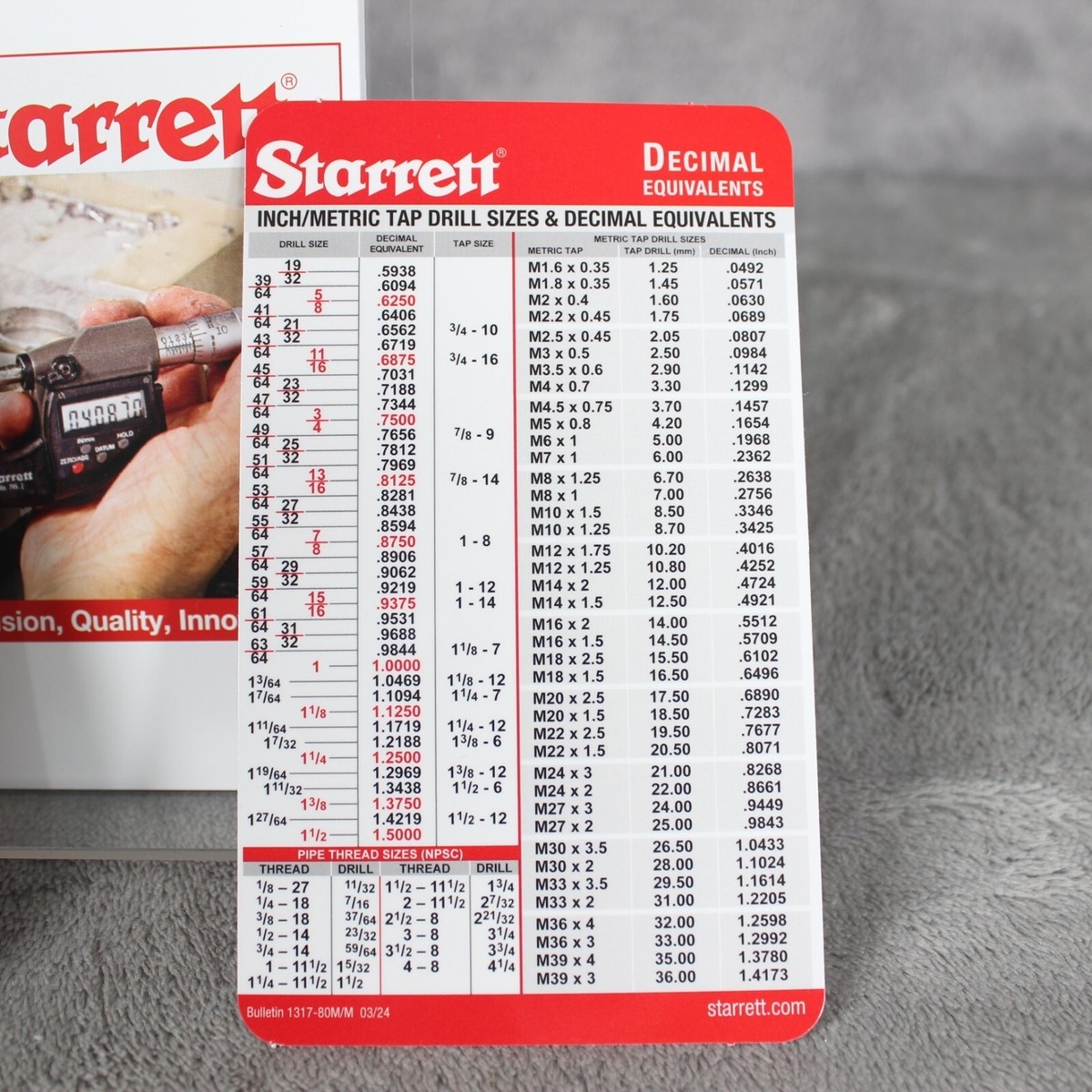 7 Pack STARRETT Tap Drill Size Chart Decimal U0026 Metric Equivalent Pocket Cards