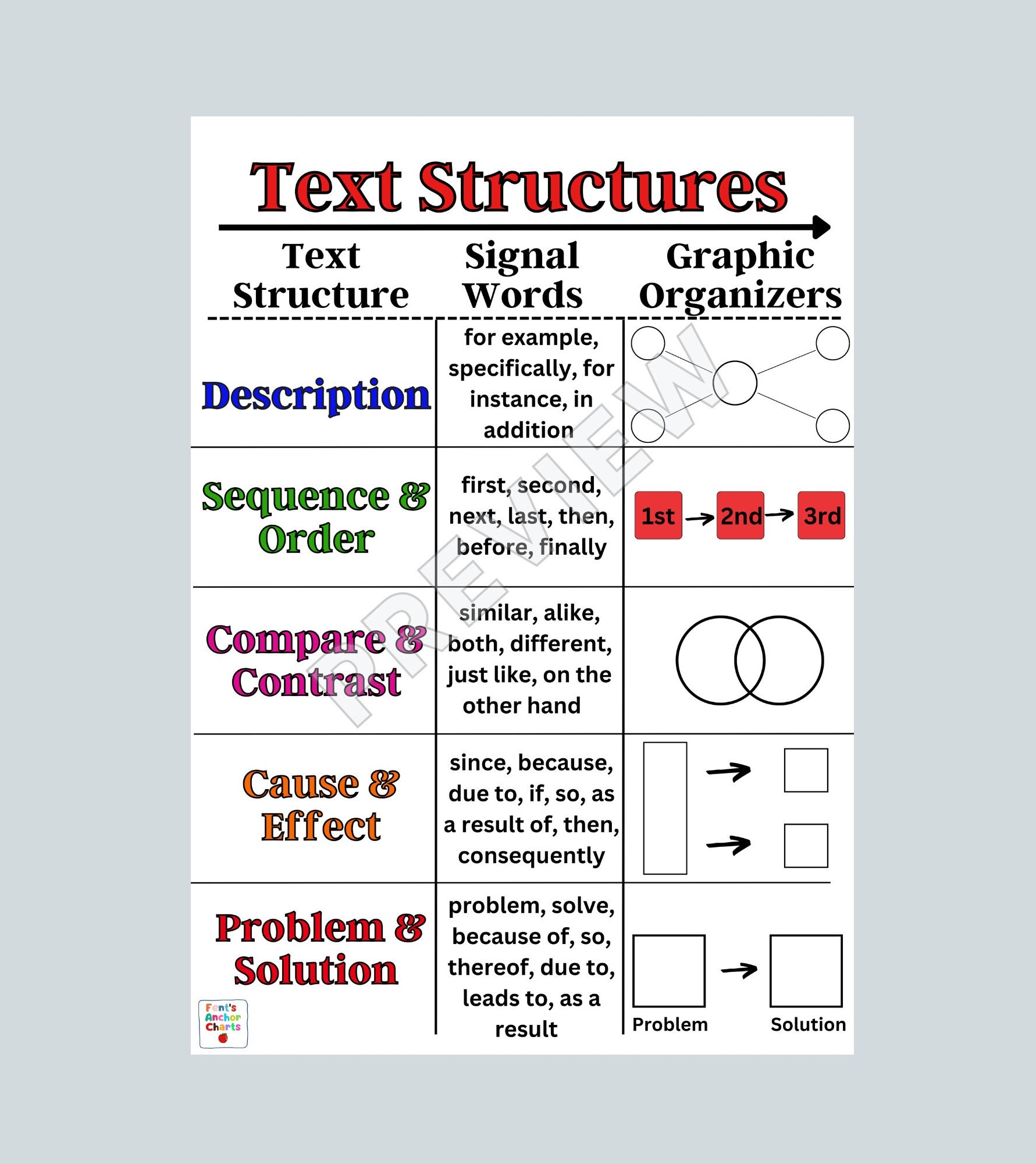 Empower your students with the knowledge they need to succeed in reading and writing. Grab your Text Structure Anchor Chart Printable now and make learning engaging and effective. Your students will thank you for it!